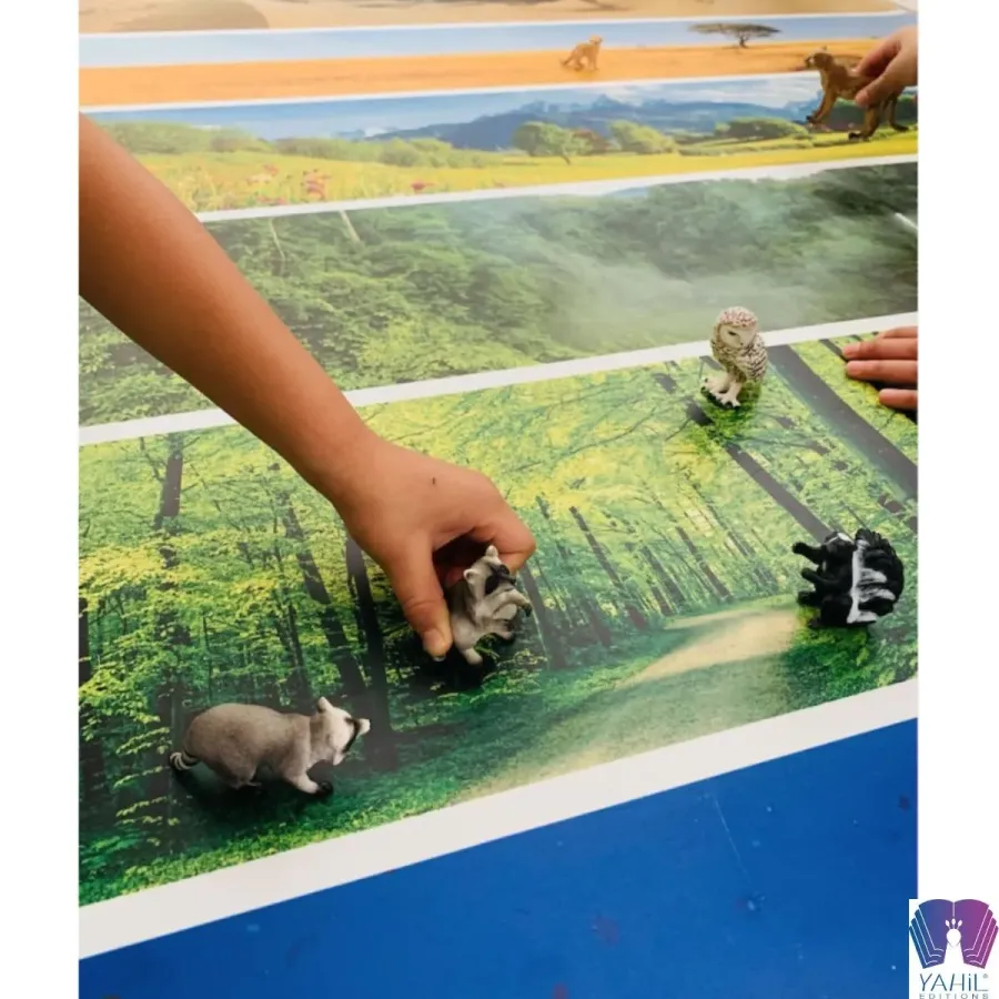 Support ludo-éducatif de 100 × 60 cm en PVC souple ultrarésistant, représentant 7 milieux naturels : le ciel, les pôles / la banquise, le désert, la savane, les prairies / la montagne, la forêt tropicale / la jungle, la forêt, l'eau.