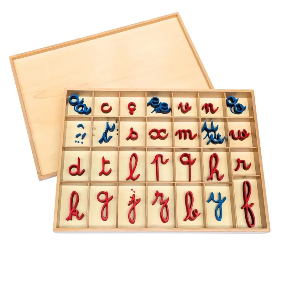 L’alphabet mobile cursif en bois Montessori permet à l’enfant de composer des mots en manipulant les lettres, avant même de savoir écrire.