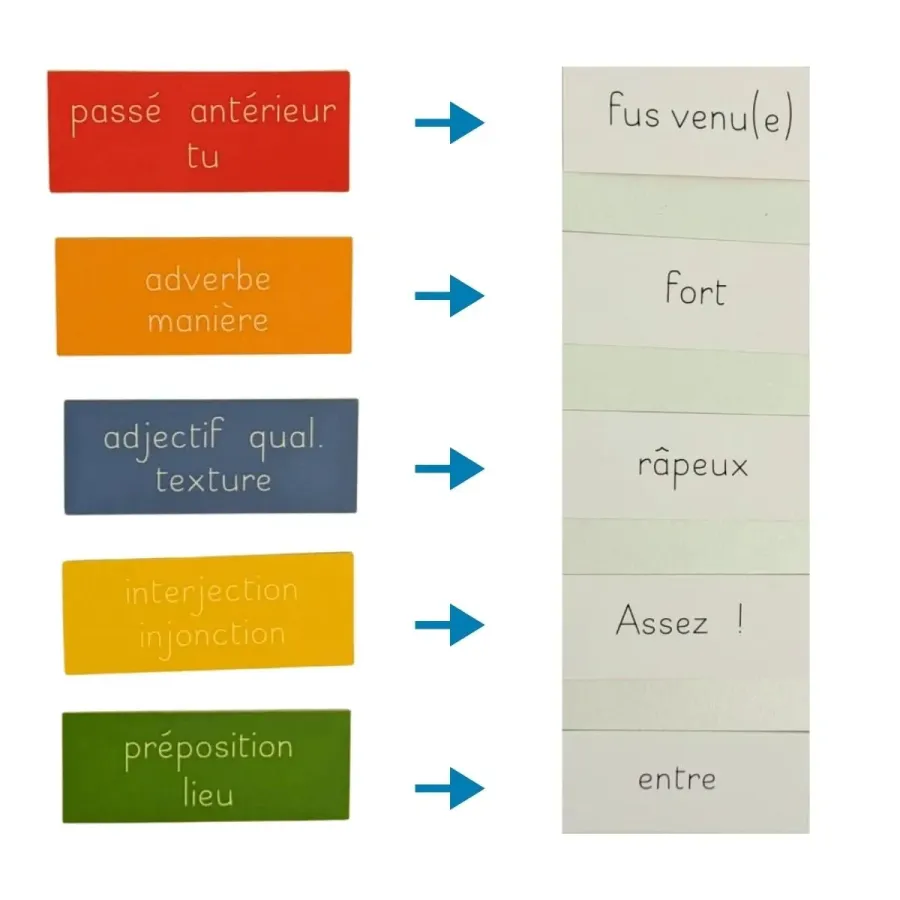 Un matériel complet de grammaire Montessori, conçu par Marie Delaru et Florence Pacou, éducatrices Montessori.